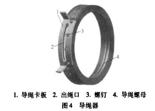 出現(xiàn)此種情況,是導(dǎo)繩器發(fā)生故障導(dǎo)致。導(dǎo)繩器安裝在卷筒上,其作用是使鋼絲繩從卷筒上順利排出和纏繞,并防止在此過程中鋼絲繩亂繩。導(dǎo)繩器是易損件,當(dāng)其磨損嚴(yán)重時,就起不到導(dǎo)繩的作用而發(fā)生亂繩,此時應(yīng)及時更換導(dǎo)繩器(見圖4)。當(dāng)傾斜起吊重物時,最容易使導(dǎo)繩器磨損,在生產(chǎn)中應(yīng)使吊裝的重物與電動葫蘆垂直。