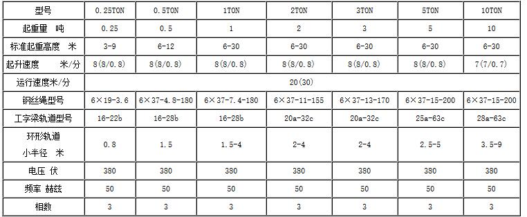 每種規(guī)格鋼絲繩電動葫蘆所對應的工字鋼軌道范圍如下圖:
