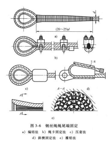 鋼絲繩在使用中需與其他承載構(gòu)件連接傳遞載荷,繩端連接處應(yīng)牢固可靠,常用的繩端固接方式(見(jiàn)圖3-6)。